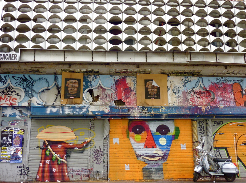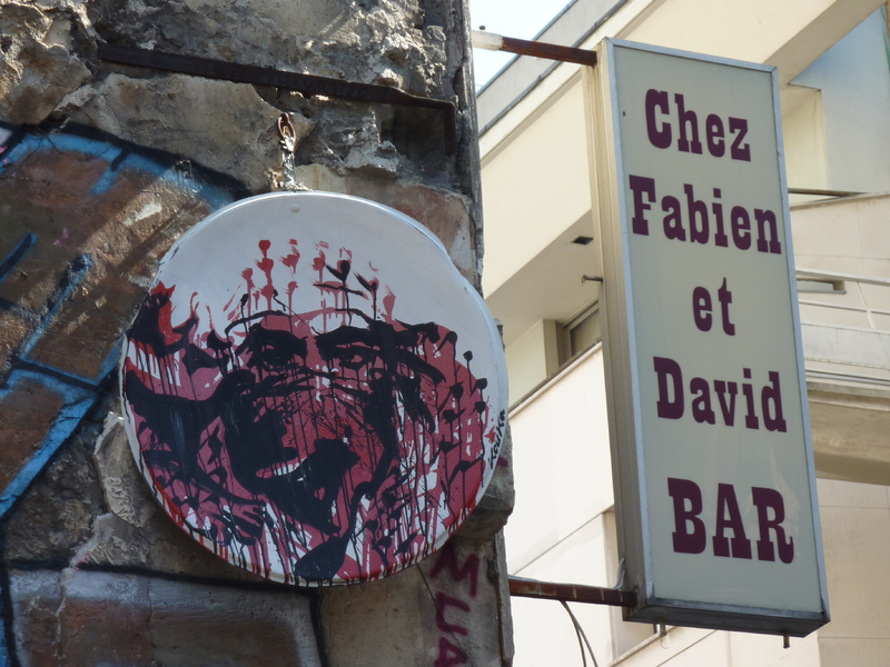 Bar/Restaurant cacher « Chez Fabien et David ». Café tenu par une patronne originaire d’Algérie et de confession juive. La famille qui le tenait utilise les lieux pour son usage privé au moment de la prise de vue. Source : Anne Steiner, Sylvaine Conord « Belleville Cafés », éditions l’échappée, 2010, pp. 58-63. Sur la gauche, œuvre de Street art intitulée « L’enfant Blam » par Kouka. Septembre 2010.
