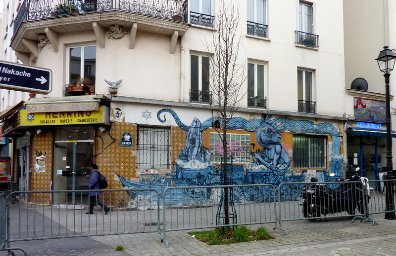 Boucherie cacher Henrino avant rénovation, avec sur la façade d’inspiration orientale une œuvre de street art non autorisée de l’artiste Roti, 122 Boulevard de Belleville, 75 020 Paris. Janvier 2013.