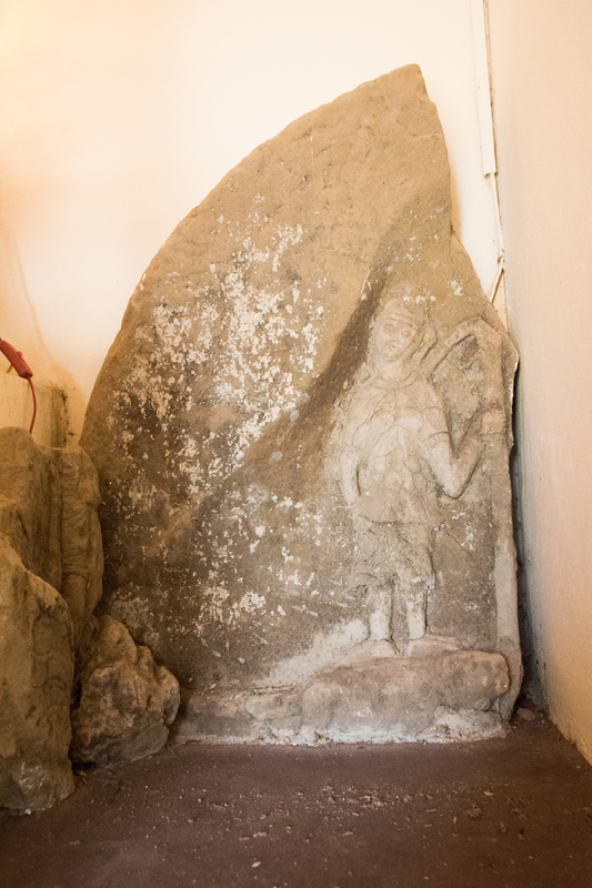 Fragment de tympan en pierre représentant un personnage debout sur un pierre semblant tenir une herminette