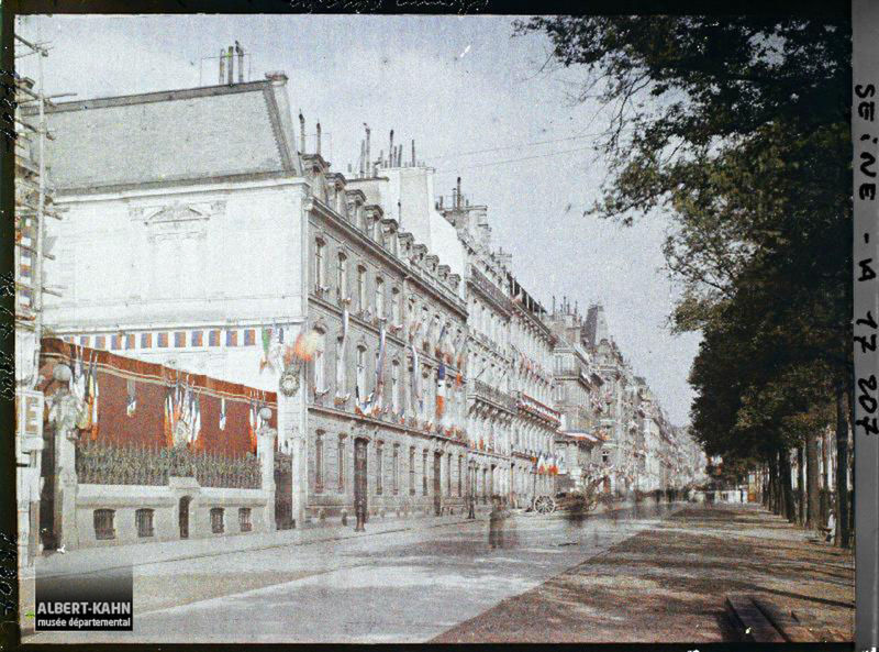 L'avenue des Champs-Elysées décorée pour le 14 juillet, au niveau du numéro 25 (actuel hôtel de la Païva)