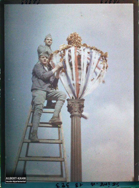 Deux soldats décorant un lampadaire pour les fêtes de la Victoire des 13 et 14 juillet 1919
