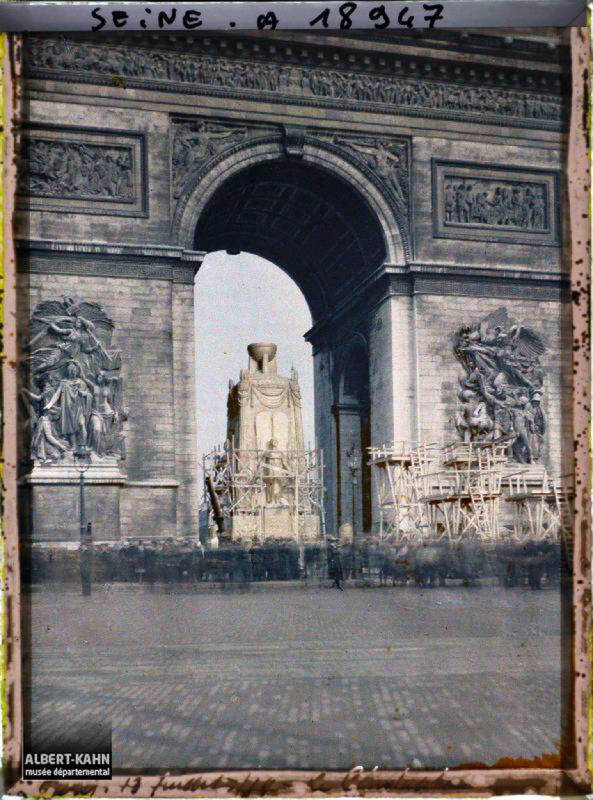 Le Cénotaphe dedié aux morts pour la patrie sous l'Arc de Triomphe pour les fêtes des 13 et 14 juillet 1919