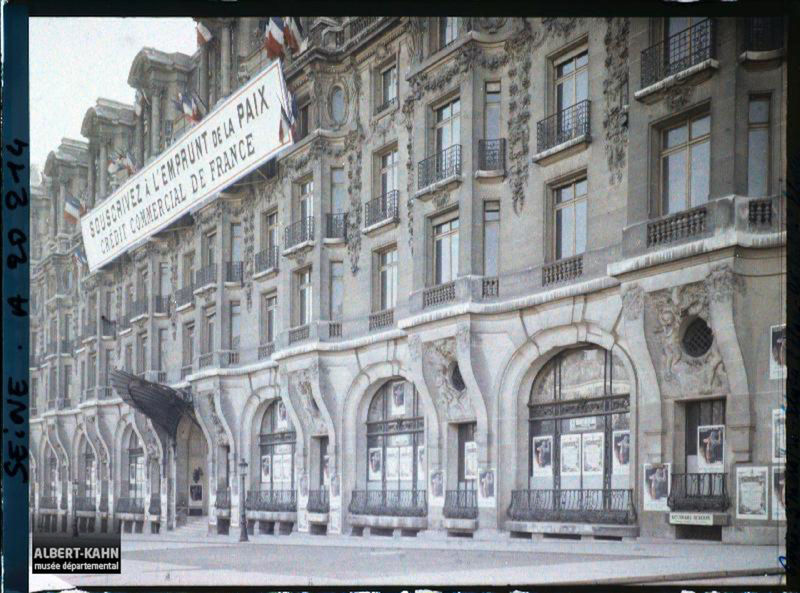 Pancarte pour l'emprunt national de 1920 sur la facade de l'hôtel Elysée-Palace au 103 avenue des Champs-Elysées, siège social du Crédit commercial de France
